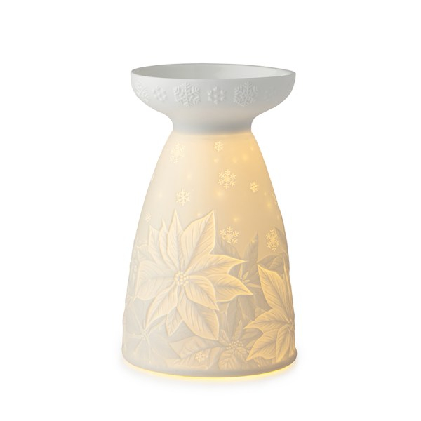 porta candela natalizio, in finissima porcellana biscuit con decoro in rilievo di stelle di natale (poinsettia), illuminata dall’interno da una luce led, con pulsante on /off alla base.