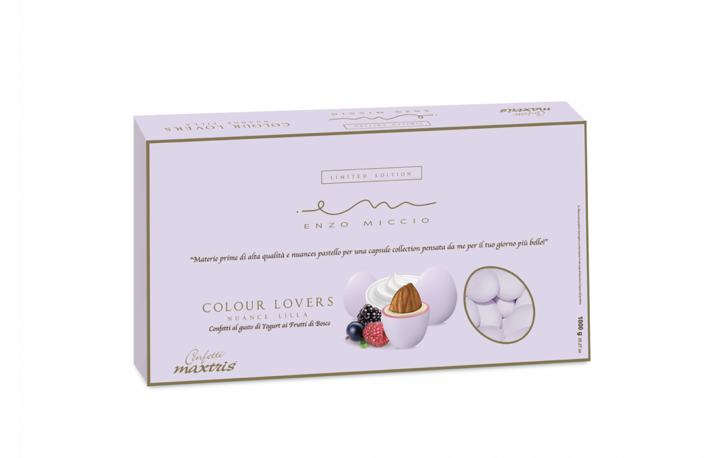 Cioccolato bianco (60%) (zucchero, latte intero in polvere, burro di cacao. Emulsionante: lecitina di soia. Aroma naturale di vaniglia), zucchero, mandorle tostate (18%), maltodestrina. Coloranti: E171, E133, E120. Aromi. Agenti di rivestimento: cera carnauba (E903), cera d'api (E901).Può contenere nocciole, noci, noci di pecan, noci di acagiù (o anacardi), pistacchi e arachidi.