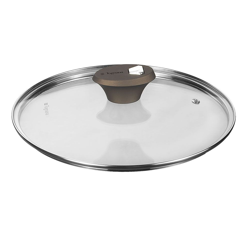 Il coperchio da 20 cm di diametro della linea Diamantea ha un corpo in vetro trasparente con sfiato che garantisce una cottura a vista, e un bordo in acciaio.