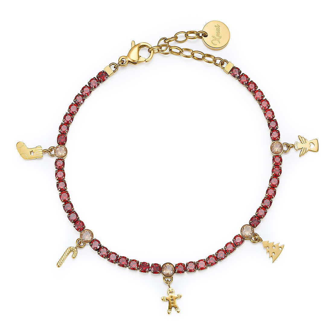 Bracciale tennis in acciaio 304, finitura oro con cubic zirconia d-garnet e cristalli champagne con pendenti a forma di calza natalizia, bastoncino di zucchero, omino pan di zenzero, albero di natale e angelo.