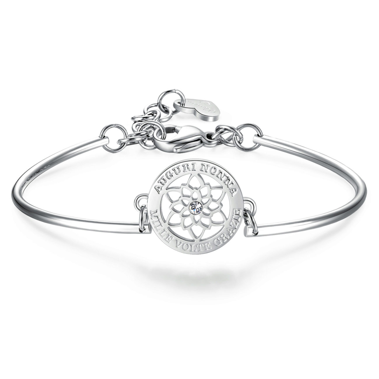 Bracciale semirigido in acciaio 316L con fiore, incisione e cristallo Swarovski®crystal. INCISIONE: Auguri nonna mille volte grazie (fronte)