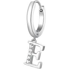 Orecchino singolo in acciaio 316L con pendente a forma di lettera E e cristalli crystal.