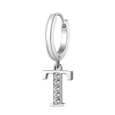 Orecchino singolo in acciaio 316L con pendente a forma di lettera T e cristalli crystal.
