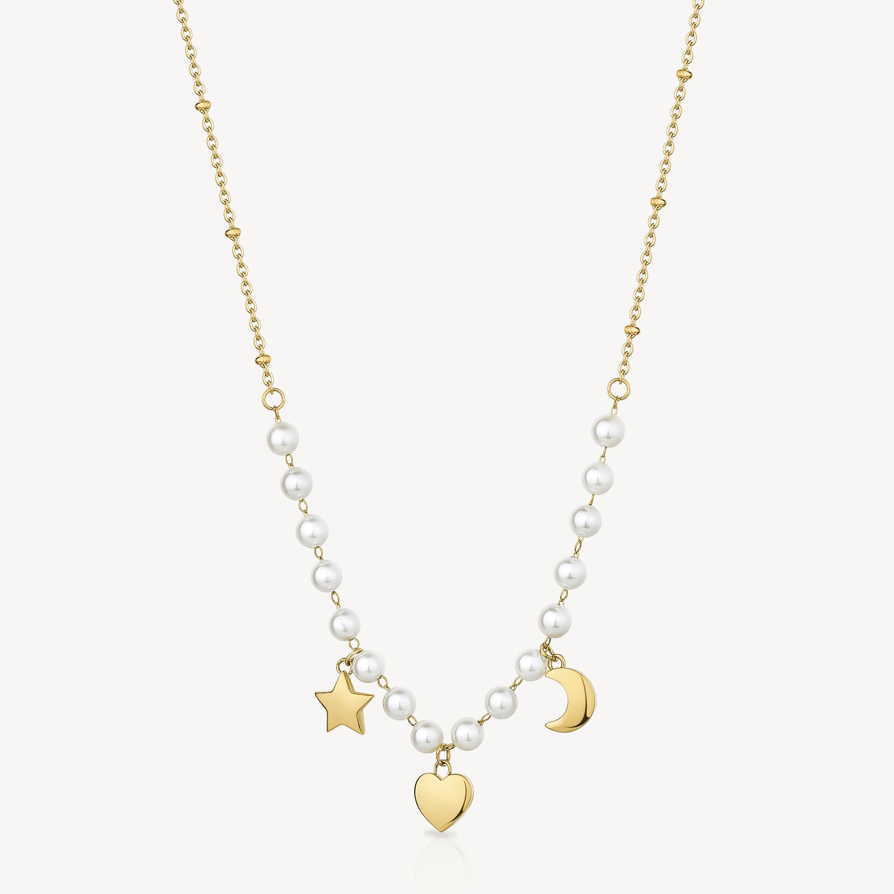 Collana girocollo in acciaio 316L, con finitura color oro, pendenti a forma di luna, cuore, stella e perle di conchiglia.