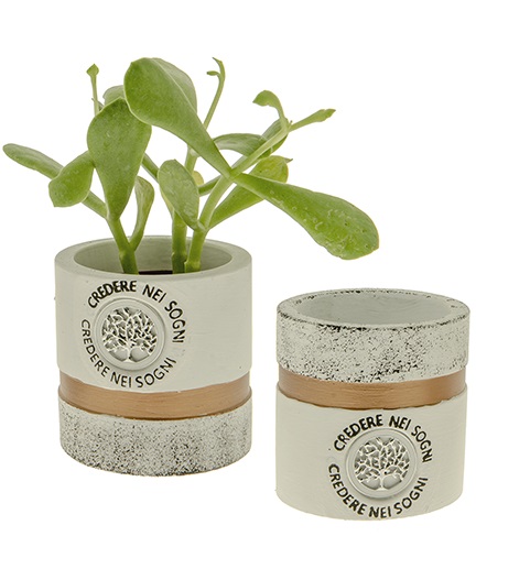 Vasetto porta piantina a forma cilindrica con scritte. Prodotto ideale per Bomboniere originali. Bomboniere Solidali Quadrifoglio Associazione ABIO.
