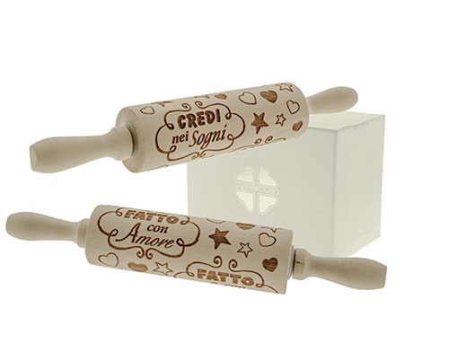 Mattarello in legno in due variazioni con scritte. Prodotto ideale per Bomboniere originali. Bomboniere Solidali Quadrifoglio Associazione ABIO.