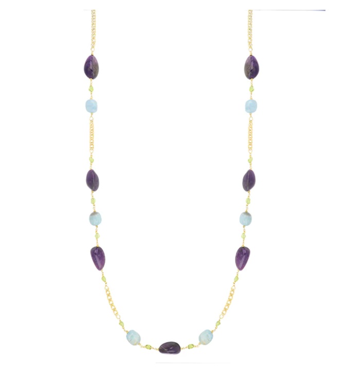 La collana di giada Mia è realizzata in argento 925 °/°° con ametista, peridotto, giada tormalina e acquamarina.
