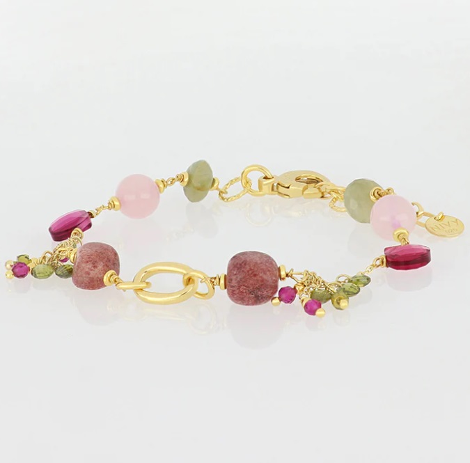 Il bracciale quarzo Vera è realizzato in argento 925 °/°° con quarzo rosa, quarzo fragola, agata militare e zirconi.